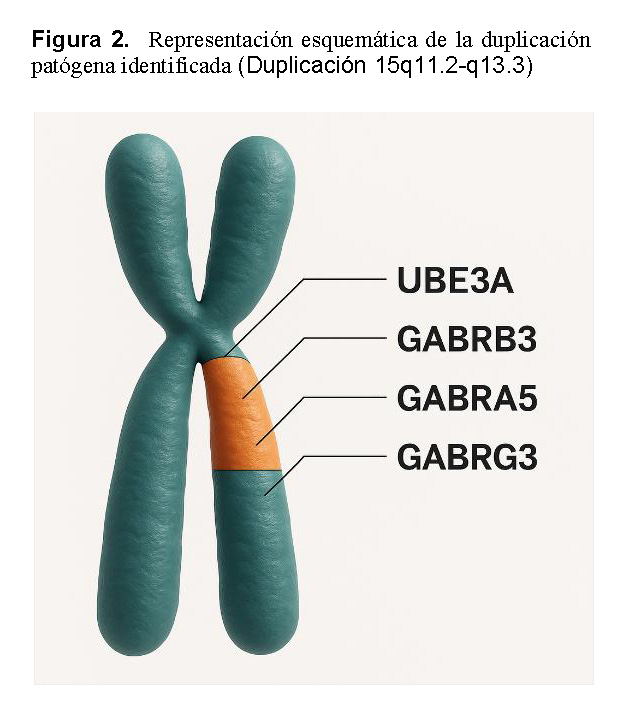 Application of this technique enabled identification of a pathogenic submicroscopic duplication in the 15q11.2–q13.3 region, thereby establishing the etiologic diagnosis and facilitating a more targeted clinical approach. Array-CGH proved to be a high-resolution method with significant diagnostic value in patients with complex neurological phenotypes, as it allows precise detection of copy number variations that are undetectable by conventional methods.