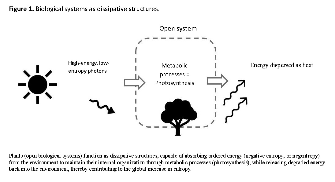 Biological systems are self-organized dissipative structures. They absorb energy from their environment to maintain vital processes and then release heat back into the environment, operating in a non-equilibrium state [21].