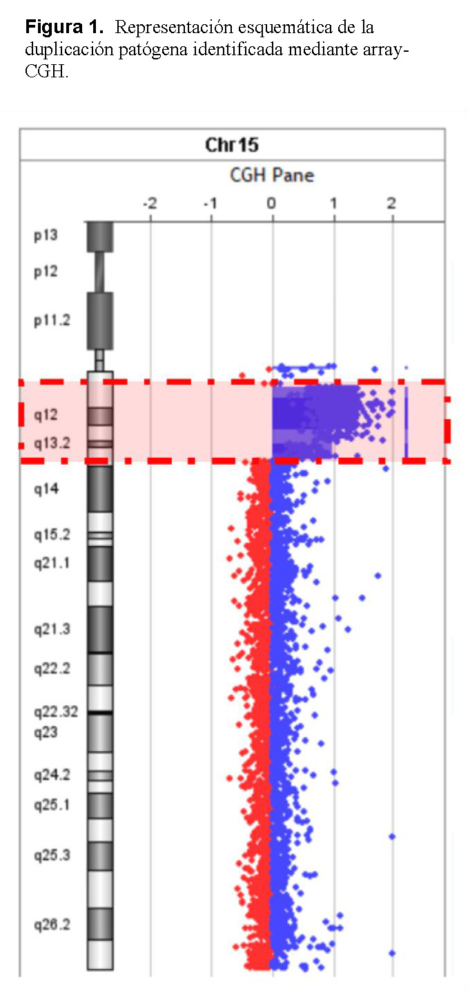 Application of this technique enabled identification of a pathogenic submicroscopic duplication in the 15q11.2–q13.3 region, thereby establishing the etiologic diagnosis and facilitating a more targeted clinical approach. Array-CGH proved to be a high-resolution method with significant diagnostic value in patients with complex neurological phenotypes, as it allows precise detection of copy number variations that are undetectable by conventional methods.