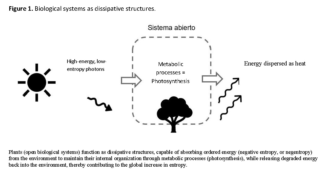 Schrödinger introduced the concept of “negative entropy” (abbreviated as negentropy) as the basis of biological organization, proposing that living beings “feed” on order (solar light) to maintain their structure far from equilibrium [10, 14]. In this context, negentropy describes local processes of organization that occur within the general framework imposed by the Second Law of Thermodynamics [7].