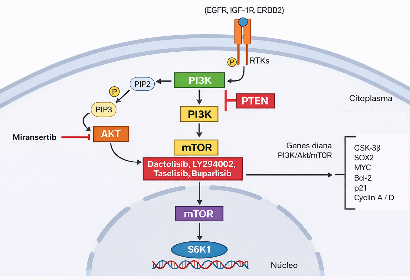 De igual manera, este bloqueo de AKT favorecerá a la apoptosis y a evitar la retroalimentación positiva de PI3K.